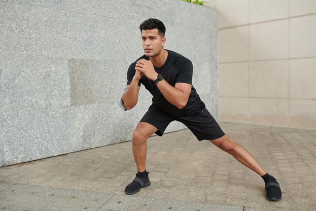 - 一腳大步向前跨,兩腳膝蓋彎曲蹲下,前腳膝關節呈90度