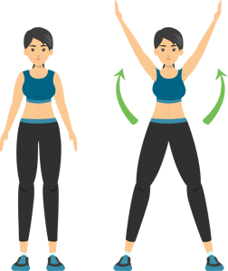 - Shoulders and Lower limb muscles: Starting with arms on the sides of body and feet together. Raise the arms above the head til they meet. At the same time jump out so the legs are apart just wider than the hips like you are forming a “star”. Then return to the starting position. (See Diagram).